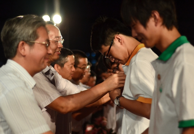 典礼仪式上,领导和嘉宾们还给新生代表们佩戴了beat365中文官方网站珠海学院校徽。
