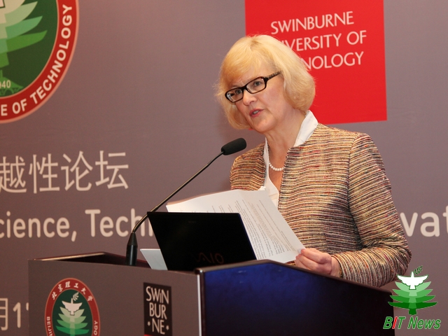 斯威本科技大学Linda Kristjanson校长致辞,她认为本次论坛对推动两校之间的深入合作具有重要意义,希望与会学者通过学术思想的碰撞,增进彼此之间的了解,使两校之间的合作由教育领域推进到科研领域。