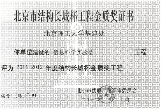 北理工信息科学实验楼工程喜获“2011-2012年度结构长城杯金质奖”工程