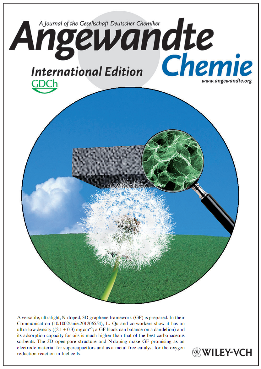 日前,化学学院曲良体教授指导的博士研究生赵扬和其他同学一起,成功制备出一种超轻的三维石墨烯泡沫结构,该石墨烯泡沫的密度仅为约2.1 mg/cm3, 轻的足以放置在蒲公英上面而不对其产生任何影响,是目前石墨烯材料中密度最小的。该泡沫不仅具有超低密度,还具有超高的吸附性能,超过现有其它碳质吸附材料。同时在空气中能忍受近600度的高温。除此之外,其在电化学超级电容器和氧还原反应方面表现出了优异的性能。该成果以“A Versatile, Ultralight, Nitrogen-doped Graphene Framework”为题发表在国际化学顶级期刊《Angewandte Chemie》(中文名称《德国应用化学》)上(影响因子13.46)。该论文被编辑选为内封面。英国皇家化学会(RSC)旗下的《Chemistry World》以“An ultralight graphene structure for all seasons”为题对此项工作进行了专门报道。