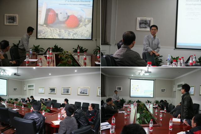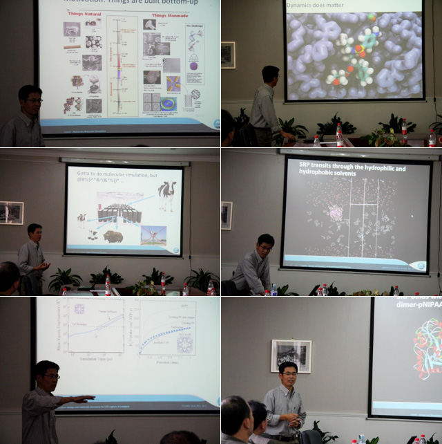 刘明昇博士首先向大家介绍了“分子动力学”这一先进的模拟研究方法,并且仔细的说明了这一方法的优越性以及其自身存在的缺点。接着分别讲述了个人亲自参与研究的一些课题及项目,例如分子马达、CO2的收集以及牛奶中各种蛋白质的提取问题。刘明昇博士通过对这些问题的分析,然后找到问题的关键所在,将问题抽象成用分子动力学可以研究的问题,经过大量的研究与模拟,获得了与实验极其相似的结果,并且广泛的用于实际生产生活中。此次报告最大的特点是,刘明昇博士所展示的大多数研究内容都是来源于工业界,从中抽象出科学问题进行研究,然后进一步指导工业生产。该形式的研究方式对开阔我院师生的研究视野具有很大的促进作用。