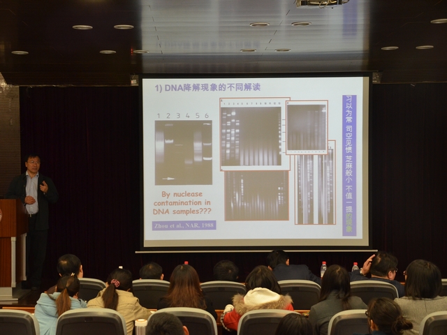 在现场热烈的掌声中,邓子新院士登上讲台,开始了本次报告会。邓院士详细地介绍了多年来在放线菌遗传学及抗生素生物合成的生物化学和分子生物学研究领域所做的科研工作,同时深情回顾了二十年来他带领他的团队在科学探索的道路上经历过的种种坎坷和挫折。 邓院士还同与会的师生们分享了他多年科研工作所凝练的心得:科研要有“不放过细节,认真思考”的精神才能发现新领域;要有“甘于寂寞,坐得住冷板凳”的精神才能把冷门捂热;要有“勤奋努力,持之以恒”的精神才能让热门升华。 邓院长以其严谨谦逊的人格、渊博深厚的学识、科学独特的视角、机智幽默的言语深深感染了与会师生,现场多次响起热烈的掌声。