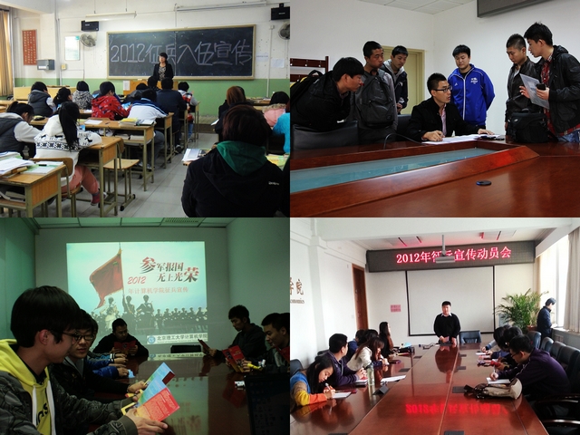 武装部在校内进行广泛的征兵宣传活动,将今冬征兵宣传材料分发至中关村校区、良乡基础教育学院以及房山高职学院;各专业学院纷纷召开征兵政策宣讲会,对所有适龄在校生进行应征和优抚政策的宣传。