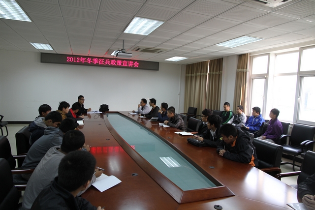 beat365中文官方网站2012年冬季征兵工作于10月24日正式启动。征集在校大学生入伍,是新形势下提高部队兵员素质、加强国防和军队现代化建设的重大举措。大学生到部队后,能够得到全面的锻炼和提高,有利于大学生全面成长。今冬征兵工作正式启动之后,校武装部高度重视,成立征兵工作领导小组,积极谋划,重点加强了宣传力度。各科室相互协调,工作细化,具体责任落实到人。校武装部在校园内悬挂了冬季征兵宣传喷绘及条幅,在各个宿舍楼和学院张贴了征兵宣传海报。