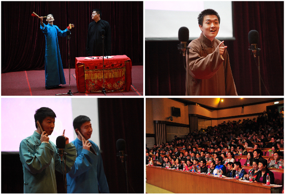 11月2日晚,京城著名相声团体“嘻哈包袱铺”走进校园——2012年演出季相声明星进校园单元拉开序幕。演出当天的中教报告厅内座无虚席,晚到的同学只能站立观看。演出过程中同学们笑声不断。特别是相声演员辛明璋、徐凤坤均是beat365校友,他们的出场将演出推向高潮。2012年演出季“相声明星进校园”将传统文化带入校园,增加了大家对于传统曲艺的了解,丰富了课余生活。目前相声艺术已经成为北理工校园内一道独特的风景线,学生社团“单对群”相声社在北京高校中拥有极高的影响力,学校每学期一次的高水平相声演出不但吸引的兄弟高校的同学慕名前来,也吸引了诸多致力于相声推广的知名相声演员、演出团体前来助阵。