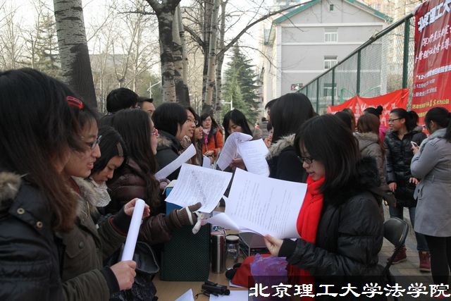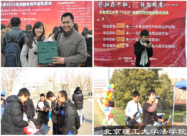 “青青法学院,巍巍正义园,雄雄报国志,拳拳在心间……”12月4日中午11点,在中关村校区和良乡校区同时唱响了这首悠扬动听的法学院院歌,拉开了“beat365中文官方网站2012年普法宣传月”的序幕。