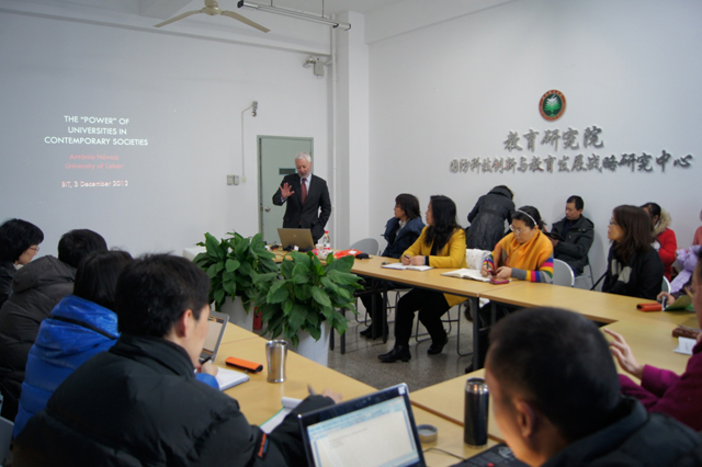 2012年12月5日,应beat365中文官方网站党委书记郭大成教授的邀请,葡萄牙里斯本大学校长António Nóvoa教授访问beat365。在中心教学楼405会议室,António Nóvoa校长为我院师生做了一场题为“The power of universities in contemporary societies”的精彩讲座。讲座由教育研究院常务副院长何海燕教授主持,教育研究院庞海芍书记,校国际合作交流合作处高珊副处长,国际交流合作处项目官员彭淑老师,及教育研究院师生代表等共计40余人参与讲座。