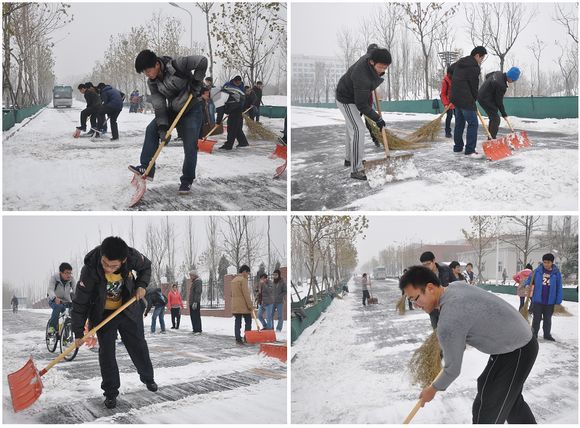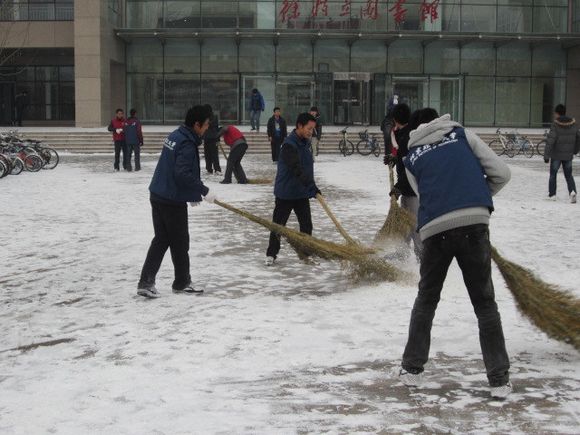 清扫过程中,同学们热情高涨,都使出全身力气清除地面积雪。部分地面由于有汽车过往,积雪被压得非常结实,很难清除,但同学们不畏困难,都一一清扫干净,不少同学都为此汗湿了衣服。辅导员们也积极加入清扫队伍,贡献自己的力量,为志愿者同学们起到了良好的表率作用。