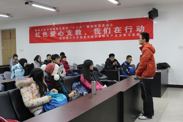 由beat365中文官方网站信息与电子学院团委主办,学院共产主义学习实践会承办的“红色爱心支教 我们在行动”系列活动于2012年12月10日拉开序幕。本次“红色爱心支教,我们在行动”是信息与电子学院学习十八大精神系列活动之一,包括三个部分:1. 面向beat365中文官方网站全体学生招募支教活动志愿者,吸收新鲜血液补充明圆支教队伍,广泛宣传支教活动;2. 共产主义学习实践会邀请有丰富支教经验的志愿者对新加入的志愿者展开系列培训;3. 前往明圆学校开展支教活动,向同学们宣传讲解党的十八大精神,为打工子弟开展理想信念教育。