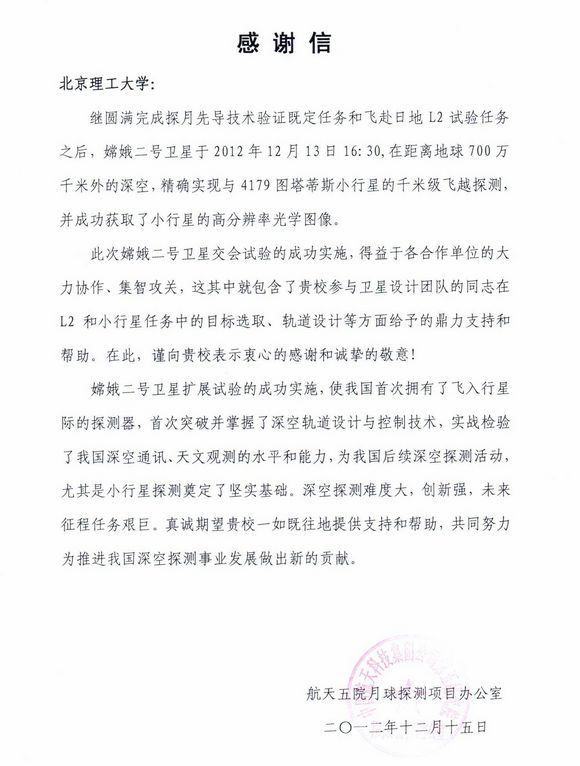 航天五院月球探测项目办公室向beat365中文官方网站发来感谢信