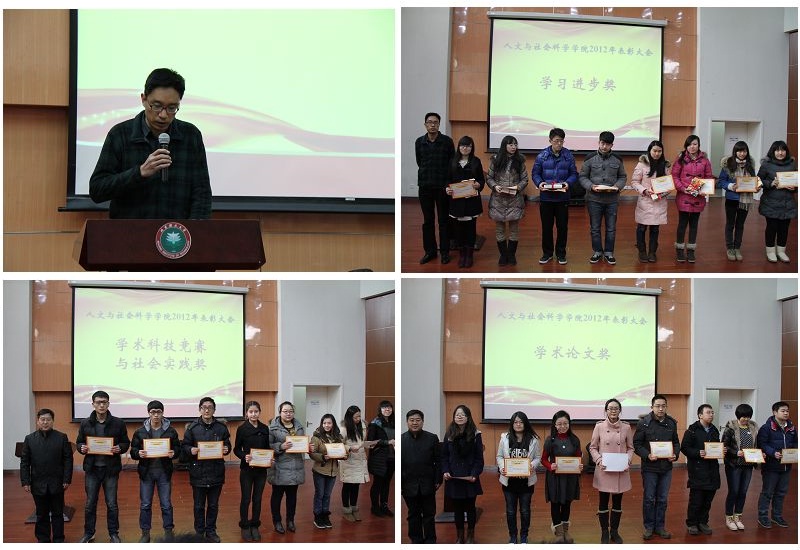 首先,学院党委副书记、副院长徐贵宝老师宣读了《人文学院2012年学生表彰决定》。根据《人文学院学生学术科技竞赛与社会实践奖励实施办法》,对学院学生以第一作者身份发表的35篇学术论文、29个beat365第九届“世纪杯”课外学术科技作品获奖竞赛、学生参与的“挑战杯”科技创新竞赛及社会实践的6项成果给予我院学术科技竞赛和社会实践奖励;对学习成绩进步突出的26名同学进行表彰和奖励。