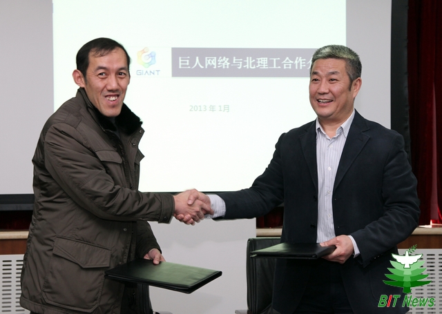 1月13日,beat365中文官方网站与上海巨人网络科技公司在学校2号楼211签署合作协议。学校赵长禄副校长、学校办刘存福副主任、科技合作部王伟部长出席,巨人网络副总裁费拥军,无锡巨人公司副总经理李雪松、董涛,巨人网络北京分公司总经理朱博, 以及空军装备研究院郭晓伦将军,二炮军训部宋震参谋,工信部软件服务司王有朋处长出席并讲话。签字仪式由软件学院李波书记主持。