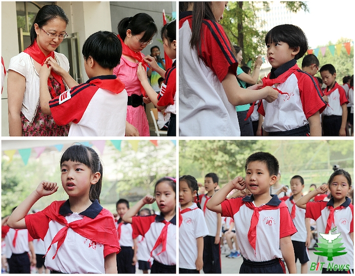 在清晨和煦的阳光下,全校师生和家长们纷纷来到彩旗飘扬的校园,他们在欢快的歌声中忙碌着、准备着,为校园带来第一份节日的快乐与祥和。上午8点,庄严的入队仪式正式开始。少先队员们各各精神抖擞,一年级新入队的同学们更是神采飞扬。在坚定嘹亮的宣誓声中,在少先队鲜红的旗帜下,他们终于成为了光荣的少先队员,崭新的红领巾第一次在他们胸前绽放光彩。接着,新队员代表王适仪同学代表新队员讲话,表达了心中的美好愿望。一年级三个新中队也随即产生。“时刻准备着”,全体少先队员铿镪有力的呼号声响彻校园,入队仪式在呼号的余音中结束。