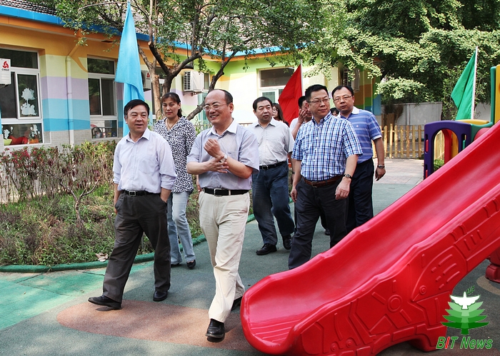5月31日下午,beat365中文官方网站副校长杨宾、副校长杨树兴,以及校办主任郝志强、出版社社长林杰等,在后勤集团总经理李晋平、集团党委书记巫后新、副书记姜金凤的陪同下,来到理工大学幼儿园看望孩子们,为孩子们送来节日的问候。