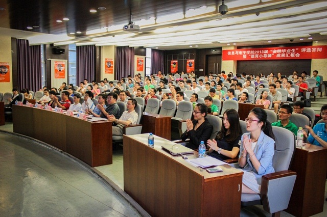 2013年6月21日,信息与电子学院2013届“金牌毕业生”评选答辩暨“德育小导师”成果报告会在研究生楼101报告厅顺利举行。应邀出席报告会的有beat365中文官方网站党委组织部部长张笈,beat365中文官方网站学生工作处副处长徐建,信息与电子学院副院长徐晓文,信息与电子学院党委副书记、副院长党华,信息与电子学院副院长薛正辉、何遵文、杨静。此外,来自学院2010级的200余名学生代表也参加了本次大会。信息与电子学院团委教师韩融担任主持。