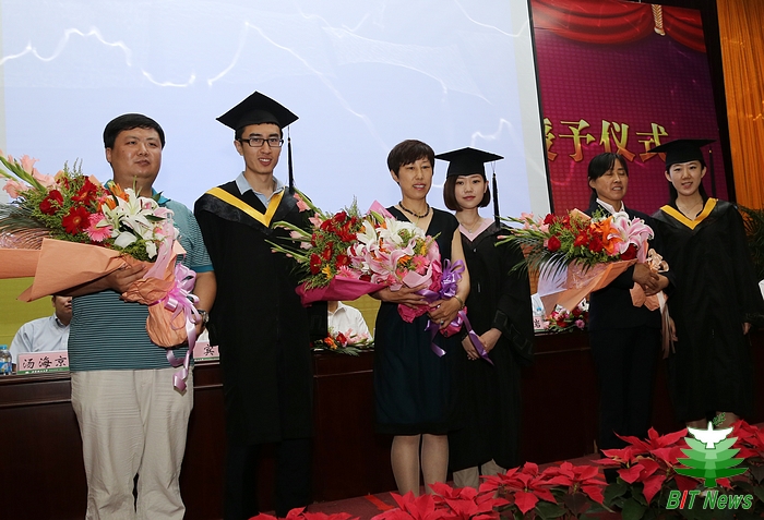 物理学院王菲老师代表全校教师对同学们顺利完成学业表示热烈的祝贺,他希望毕业生们在自己选择的道路上无惧无畏、坚持到底,带着北理工人特有的脚踏实地、实事求是的品质,在人生的长路上勇往直前。职工代表、教学楼管理员项振英质朴平实的语言感动了在场同学,她把同学们当作自己的孩子对待,无微不至的关怀、全心全意的付出。她勉励同学们用一颗包容而豁达的心去发现生活中属于自己的每个精彩瞬间。学生家长代表王丽梅向学校和老师们致以衷心的感谢,并希望同学们在振翅高飞之时,牢记北理工优良的传统与作风,牢记亲情的温暖和温馨,奋斗不息,成为对国家、对社会有用的栋梁之才。毕业生代表向父母和教职工代表献花,表达感激之情。随后播放了短片《感谢北理工》,短片中熟悉的画面和场景引起了毕业生的强烈共鸣。