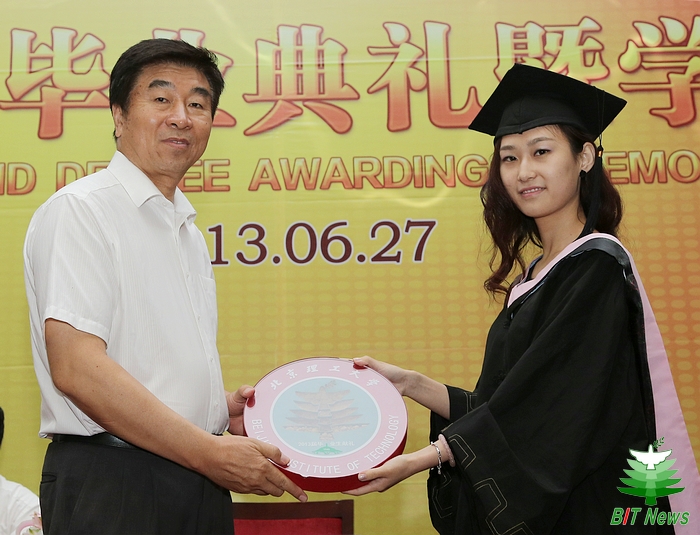 设计与艺术学院代表2013届毕业生向母校赠送纪念品——“北理足迹”校徽模型,郭大成代表学校接受赠送。
