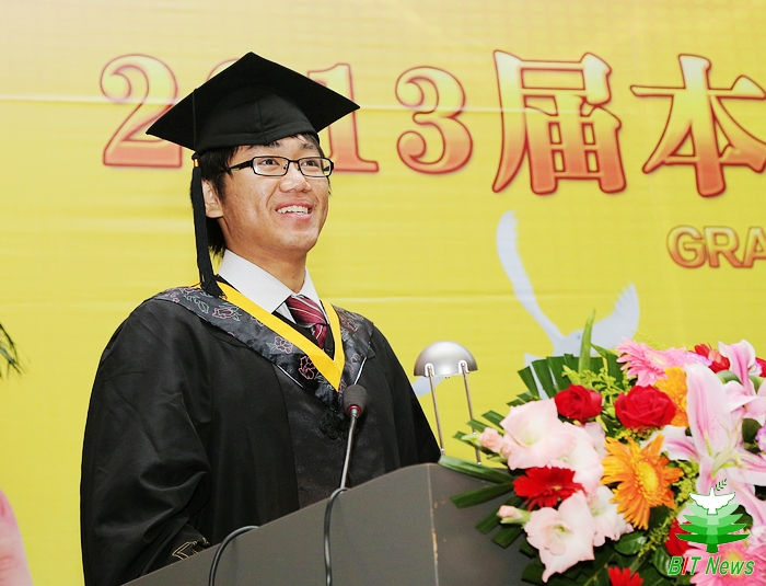软件学院2013届毕业生王子实代表全体毕业生发言,他与大家一起回顾了四年大学生活中难忘的片段,表达了对母校、对老师、对同学的感恩之情,并表示将带着北理工的烙印在今后的道路上奋力拼搏,谱写绚烂的人生篇章,创造属于自己的辉煌。