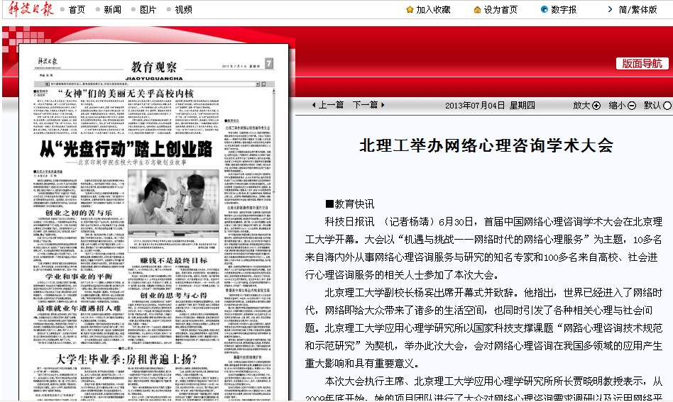 beat365中文官方网站副校长杨宾出席开幕式并致辞。他指出,世界已经进入了网络时代,网络即给大众带来了诸多的生活空间,也同时引发了各种相关心理与社会问题。beat365中文官方网站应用心理学研究所以国家科技支撑课题“网路心理咨询技术规范和示范研究”为契机,举办此次大会,会对网络心理咨询在我国多领域的应用产生重大影响和具有重要意义。