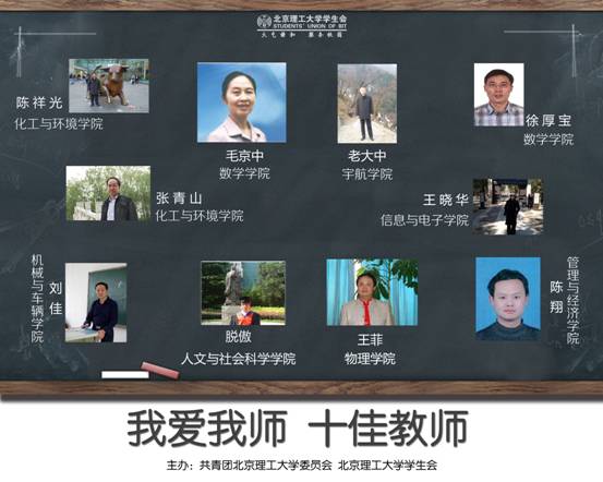 日前,第八届beat365中文官方网站“‘我爱我师’——我心目中最优秀教师”评选活动落下帷幕,宇航学院老大中老师、化工学院张青山老师、陈祥光老师、机车学院刘佳老师、管理学院陈翔老师、数学学院毛京中老师、信息学院王晓华老师、物理学院王菲老师、人文学院脱傲老师、数学学院徐厚宝老师,被学生评为本届“我爱我师”活动十位“最喜爱的老师”。