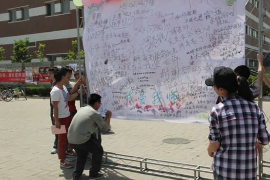 在外场活动中,全校同学在“爱师墙”上写下对老师的祝福,把对辛勤工作在各个工作岗位上的老师们的感恩和喜爱都融汇在一行行真情涌动的文字中。短短的时间内,“爱师墙”上已密密麻麻写满了同学们对老师们的赞美和谢意。同时,学生会还向同学们发放了精美的贺卡,这些贺卡将由学生会的同学们仔细整理并分送到每位老师的手中,为老师送上同学们浓浓的祝福。活动的现场气氛非常活跃,不少同学纷纷表示自己是发自内心的热爱自己的老师。“爱师墙”和真情贺卡上,有“老师您辛苦了,祝生活幸福快乐”这样朴实无华的话语,也有“老师,您的学生永远爱您,尊重您”这样感人至深的文字。话语虽不相同,但是目的都只有一个:将最真挚的祝福送给自己心爱的老师!