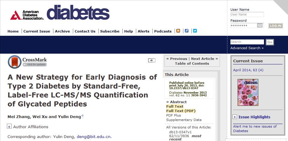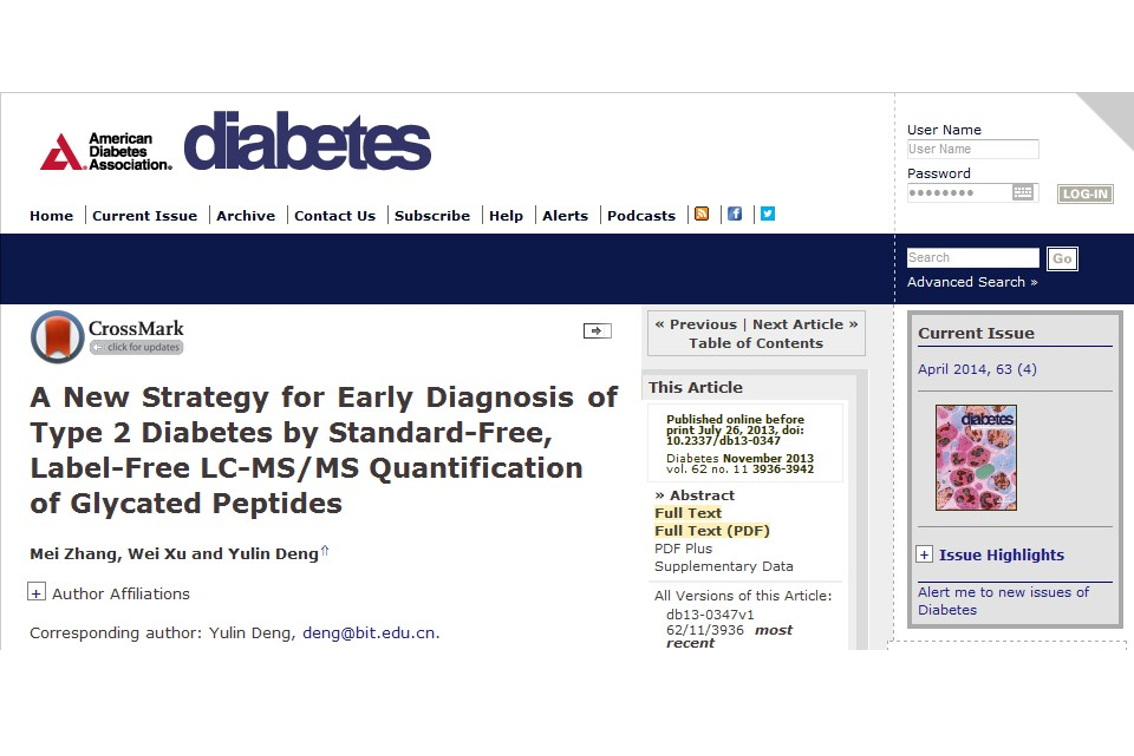 基于该研究成果,由生命学院邓玉林教授、徐伟教授和张玫博士撰写的研究论文《A New Strategy for Early Diagnosis of Type 2 Diabetes by Standard-Free, Label-Free LC-MS/MS Quantification of Glycated Peptides(2型糖尿病无标定、无标记定量糖基化肽高效液相色谱质谱早期诊断新策略)》已被糖尿病研究领域的顶级期刊《Diabetes》接收并发表,在生命科学与临床医学领域形成了重要影响。