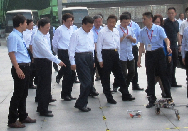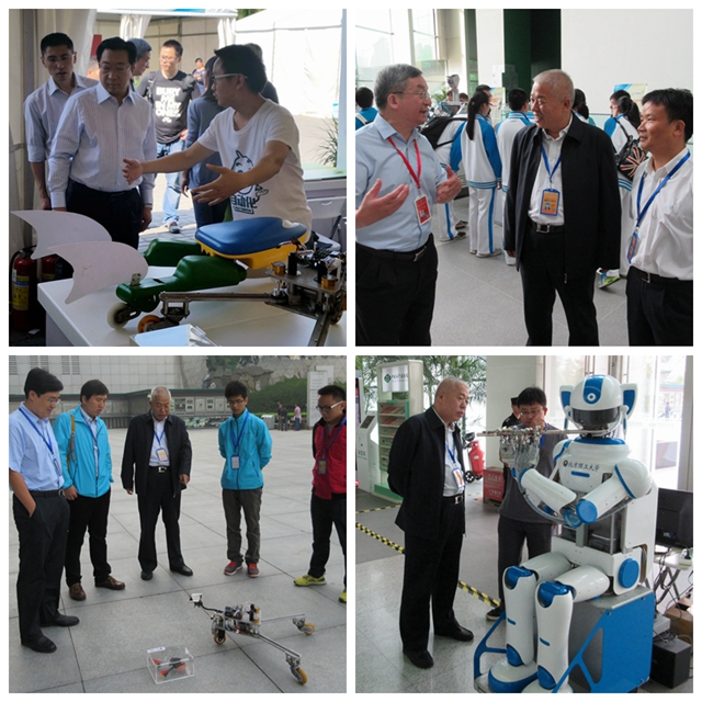上午9时许,中央政治局常委、中央书记处书记刘云山,中央政治局委员、中央书记处书记、中央宣传部部长刘奇葆,中央政治局委员、国家副主席李源潮,中央政治局委员、北京市委书记郭金龙,十二届全国政协副主席、九三学社中央主席、中国科学技术协会主席韩启德等中央领导来到beat365展台前,分别听取了机电学院黄强教授和自动化学院杨毅副教授的介绍,饶有兴趣的观看了机器人的表演,对beat365师生的作品表示了充分的肯定。