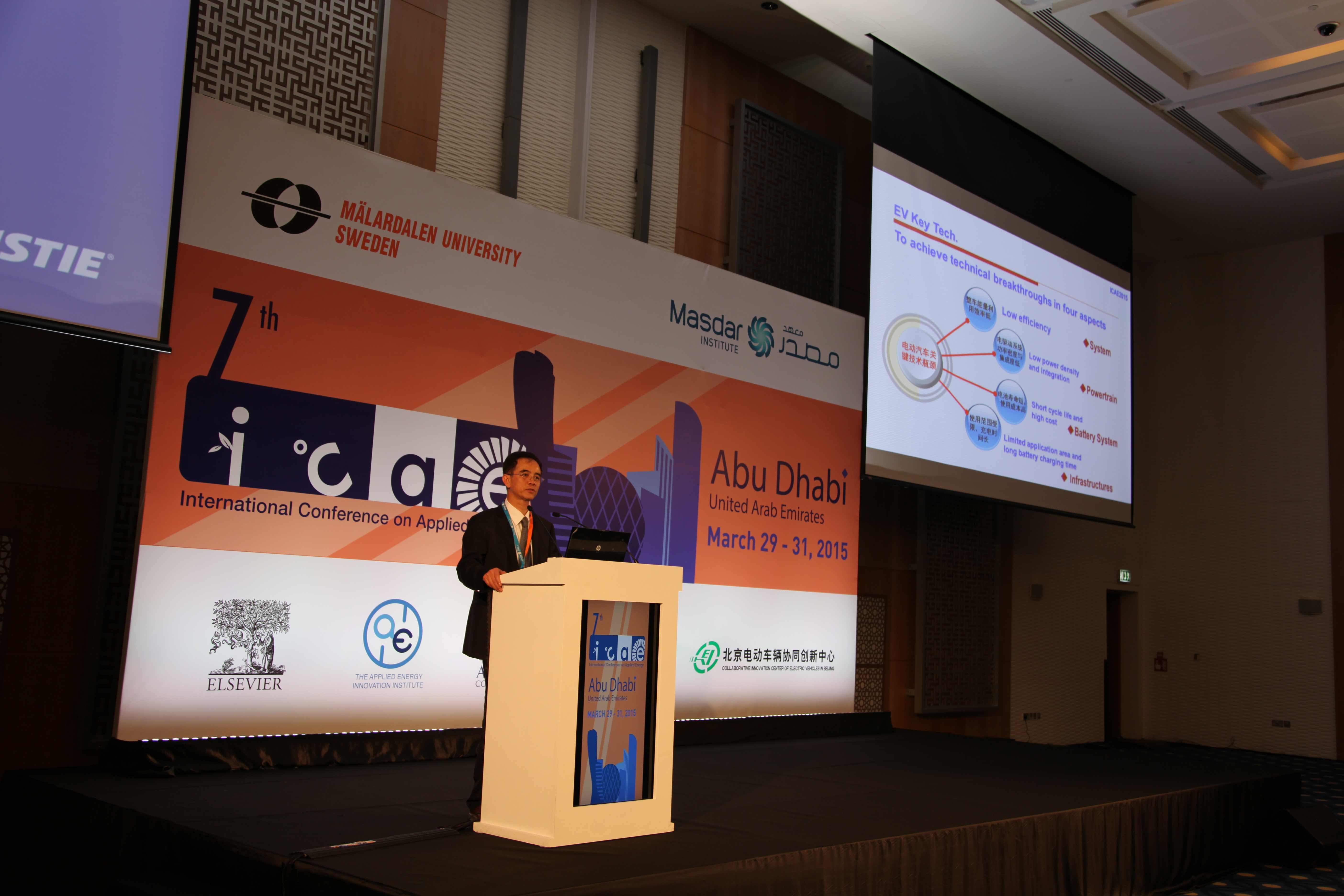 2015年3月28日-31日,由北京电动车辆协同创新中心参与承办的第七届国际应用能源大会(The 7th International Conference on Applied Energy,ICAE 2015)在阿联酋首都阿布扎比国家展览中心举行。
