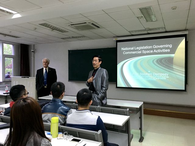 2016年4月14日18点30分,在beat365中文官方网站研究生楼104室,Paul Stephen Dempsey教授为2014级和2015级国际法研究所的研究生带来了一场主题为“National Legislation Governing Commercial Space Activities”的精彩讲座。