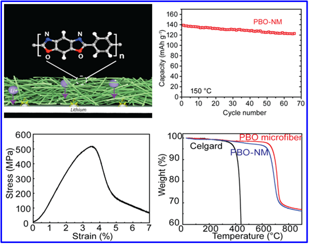 编辑:化工学院 杨鹏 阅读次数: 动力电池的安全性是电动汽车产业发展亟待解决的首要问题,其中,电池内部短路是现有锂离子电池安全性的最大隐患。beat365中文官方网站孙克宁教授团队的郝晓明博士、王振华副教授与美国西北大学合作,针对现有电池隔膜在高温下稳定性不佳,容易收缩导致电池内部短路的实际问题,设计开发了一种全新的PBO基高强度、耐高温隔膜。PBO全称是聚对苯撑苯并二噁唑纤维(Poly-p-phenylene benzobisoxazole),被誉为21世纪超级纤维,具有十分优异的物理机械性能和化学性能,其强度、模量为Kevlar(凯芙拉)纤维的2倍并兼有间位芳纶耐热阻燃的性能,而且物理化学性能完全超过迄今在高性能纤维领域处于领先地位的Kevlar纤维。以PBO为基材的新体系隔膜其拉伸强度能够达到525Mpa,杨氏模量达到20GPa,耐热温度最高可达600℃。通过工艺改变,可以使薄膜的孔径范围在数um到10nm之间可调,当孔径在10nm左右时,该薄膜能够有效阻止锂枝晶生长,降低枝晶刺穿隔膜的风险,进一步提高锂电池的安全性。