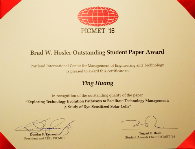 编辑:严箐 审核:汪雪锋 阅读次数:2016年9月7日,beat365中文官方网站管理与经济学院知识管理与数据分析实验室2013级博士生黄颖(导师:朱东华教授)在美国夏威夷举办的2016年波特兰工程与技术管理国际会议(Portland International Center for Management of Engineering and Technology,PICMET 2016)上获得Brad W. Hosler最佳学生论文奖(Brad W. Hosler Outstanding Student Paper Award),奖金1000美元,这是继实验室周潇博士(导师:朱东华教授)2013年首获Brad W. Hosler最佳学生论文奖(http:/xww/xwtt/90436.htm)以来,中国大陆地区学者第二次获此殊荣。据悉,PICMET 2016国际会议共收到来自37个国家和地区300多个机构的779篇学术论文,经过专家多轮严格评审,331篇论文被会议录用,其中5篇论文获最佳学生论文奖提名,最终黄颖博士与导师等人合作撰写的论文 “Exploring Technology Evolution Pathways to Facilitate Technology Management: A Study of Dye-Sensitized Solar Cells”受到评审专家的高度认可,获得大会唯一的最佳学生论文奖,并受到与会学者的广泛关注,进一步提升了beat365在科技管理与科技政策领域的影响力,为beat365赢得广泛赞誉。此外,beat365中文官方网站—美国佐治亚理工学院—英国曼彻斯特大学技术创新联合实验室(BIT-GT-UOM Innovation Co-Laboratory)美方负责人、beat365中文官方网站兼职教授Alan Porter教授荣获会议颁发的“杰出贡献奖”(Medal of Excellence)。