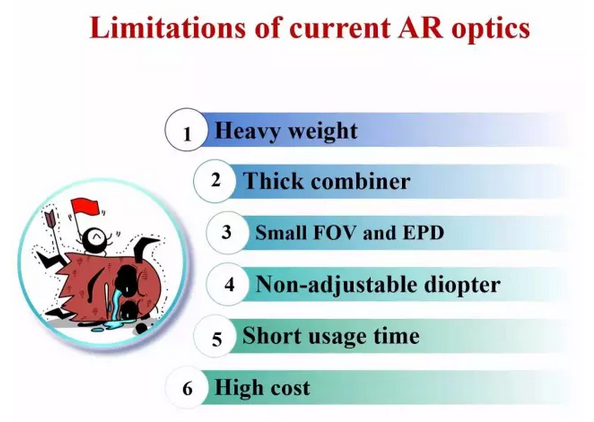 目前,增强现实头盔还存有一些问题。第一,目前面世的增强现实头盔中除了Google Glass以外重量都比较重。但是Google Glass也存在视场角太小等问题,这是因为在头盔的透视部分光学的虚实融合元件都比较厚,大部分还做不到跟眼镜一样薄,而且视场角和出瞳也比较小。此外,就是大部分头盔不能调节视度。一些出瞳足够大的头盔显示器允许用户佩戴眼镜使用,但是这样的系统在佩戴舒适性上存在较大问题。