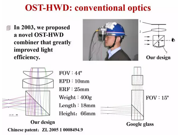 2005年我们提交了一个专利申请,描述了一种光学透射式头戴显示器,与后来Google Glass的设计比较起来基本是同一个方案,但是我们的方案加了透镜以后视场角就比Google Glass大很多,Google Glass只有15°,我们能达到44°。我们采用的是旋转对称的传统光学系统,这种光学系统一般重量比较大,而且由于当时的技术限制,用的是2.2寸的显示器,就是当时的手机显示屏,所以整个系统比较重,达到400g的重量。后来的Google Glass采用了微型显示器,同时把视场角减小以后,整个系统体积变小了,所以比较轻,但在光学系统上和我们的设计思路是完全一样的。
