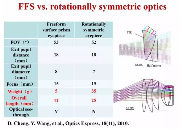 如上图所示,这是我们基于自由曲面设计的目镜和传统目镜的比较,二者均获得了国家发明专利授权。对于一般目镜来说, 能做到50多度的视场角已属不易,而且自由曲面的出瞳比这个传统光学目镜的还要大一些,同时重量是传统光学目镜的七分之一,厚度是传统光学目镜的二分之一,此外加上一片补偿镜以后,可以实现光学透射的增强显示。现在该设计已经做成性能良好的产品了。