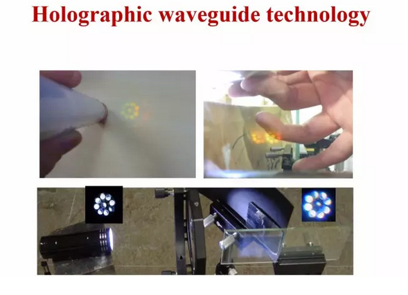 我们用全息元件和自由曲面结合起来做了一个超轻超薄的单色透视头戴式显示技术的设计,正在加工中。如果想做大视场角、高分辨率的超薄彩色透视头盔,可以采用几何波导的方法,这种方法在输入图像的时候仍然用自由曲面光学器件,输出图像使用的是一系列的半反半透玻璃,也就是几何波导。几何波导的主要问题是会产生比较强的杂光和鬼像,我们从设计、加工和镀膜等各个方面来设法消除这个鬼像,我们做的几何波导样片,厚度是2.4毫米。