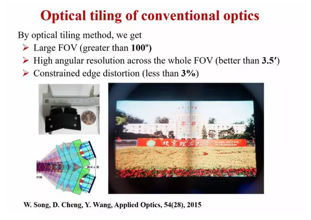 由于这种方式使用了自由曲面,所以设计上的自由度非常大,可供选择的设计方案比较多。我们的最终设计方案达到了可接受的成像效果,但是目前还有一些畸变,这些畸变需要用电子的方法来矫正。另外,我们还提出来一种把光场(light field)显示技术和我们的头戴显示技术结合起来,做头戴式真三维显示技术。
