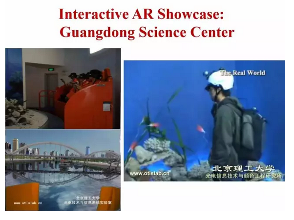 我们的透视头盔和国际上一些产品的比较可以看出我们的技术指标相当出色。另外,如下图所示我们的增强现实实验,计算机生成的任何东西都可以叠加到真实环境中。