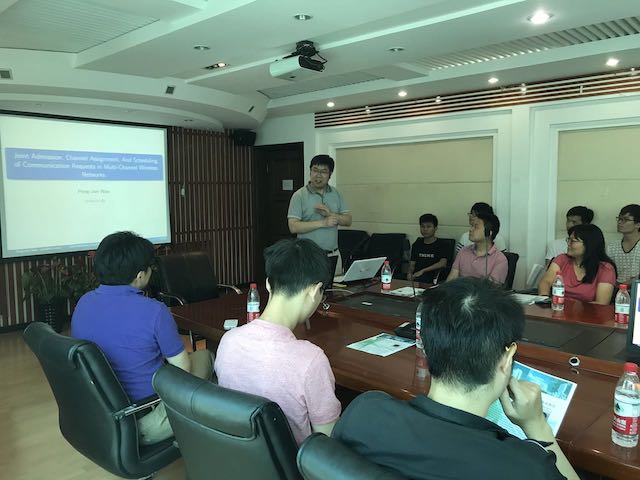 万鹏俊教授向大家讲述了无线网络领域相关的前沿研究方向、研究方法、当前的难点热点问题。万鹏俊教授通过阐述多信道无线多跳网络下点对点请求中信道分配和通信请求调度研究问题,根据无线多跳网络点对点通信中资源分配等要求,将问题总结为最大加权可行集问题,并提出了一种有效的近似最优解。该项研究成果在实际应用中具有很强的指导意义,令在场师生深受启发。