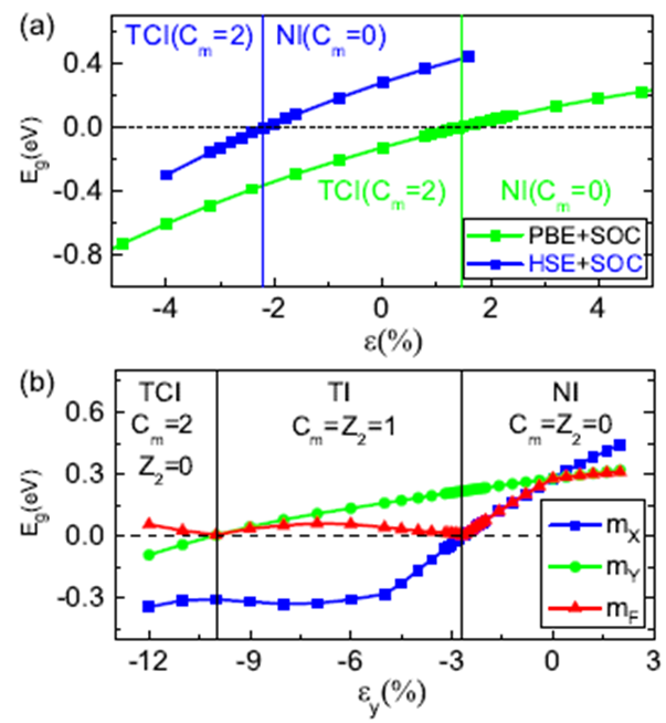 图2.单层硫化铅的带隙以及能带拓扑性质在 (a) 双轴应变和(b)单轴应变下的演变。