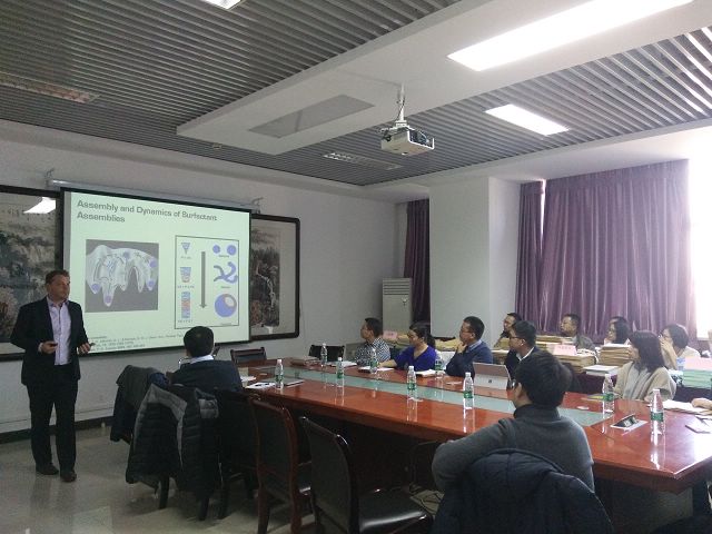 Giannesch教授概述了疾病响应传递系统的机制,介绍了通过开环歧化聚合的方法制备高功能化的聚合物支架,并将该支架运用于人体体内探针、多通道成像平台以及药物向靶组织的输送等方向的研究。讲解了液体环境透射电镜技术,展示了用其原位观察液体环境中纳米材料的行为,以及在芯片和液体杆上集成加热、冷冻元件,用于纳米材料功能性测试。这一先进技术极大地拓宽了透射电镜的研究范围。报告深入浅出,在场师生积极提问,现场气氛热烈。Giannesch教授与李霄羽教授、张加涛教授、陈琪教授等就液体环境透射电镜技术进行了深入的学术讨论,讲座在大家的意犹未尽中结束。