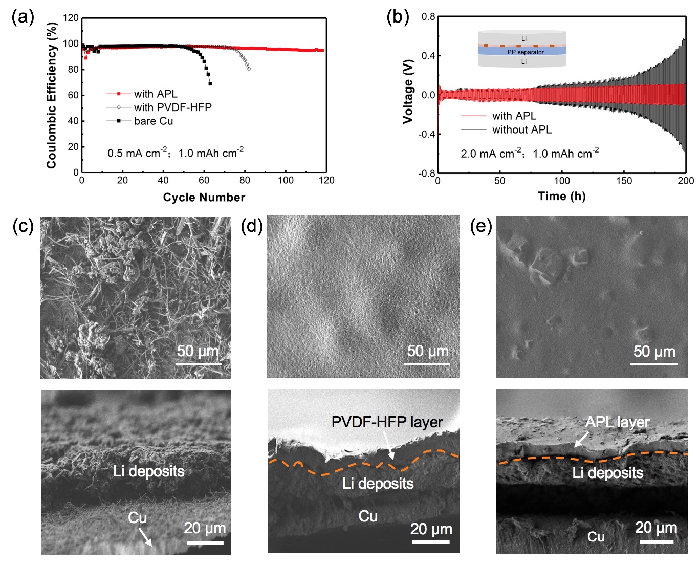 为了构建稳定的金属锂/电解液界面,调控锂的均匀沉积,该课题组提出以无机LiF为刚性组分,以PVDF-HFP聚合物为柔性组分来构建“刚柔相济”的复合膜,以在电化学循环过程中稳定金属锂与电解液的界面。其中,柔性聚合物提供的柔性和可伸缩性可承受金属锂电极沉积/溶解过程中的界面波动,而刚性组分的引入可进一步提升修饰层的机械模量,从而抑制锂枝晶生长,实现锂的均匀沉积。将这种同时具有好的形变性能、高的机械模量和离子导率的界面修饰层引入到纽扣电池中后,Li-Cu半电池、Li-Li对称电池的循环寿命以及循环稳定性都显著提升;与磷酸铁锂正极匹配的全电池测试中,复合层修饰后的电池循环寿命提升了2.5倍。