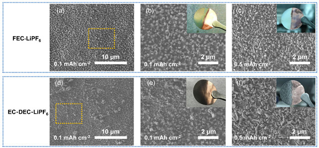 图2 金属锂表面不同结构界面膜对于锂形核点和晶核生长的影响(a-c为双层有序结构界面膜,d-f为无序界面膜)