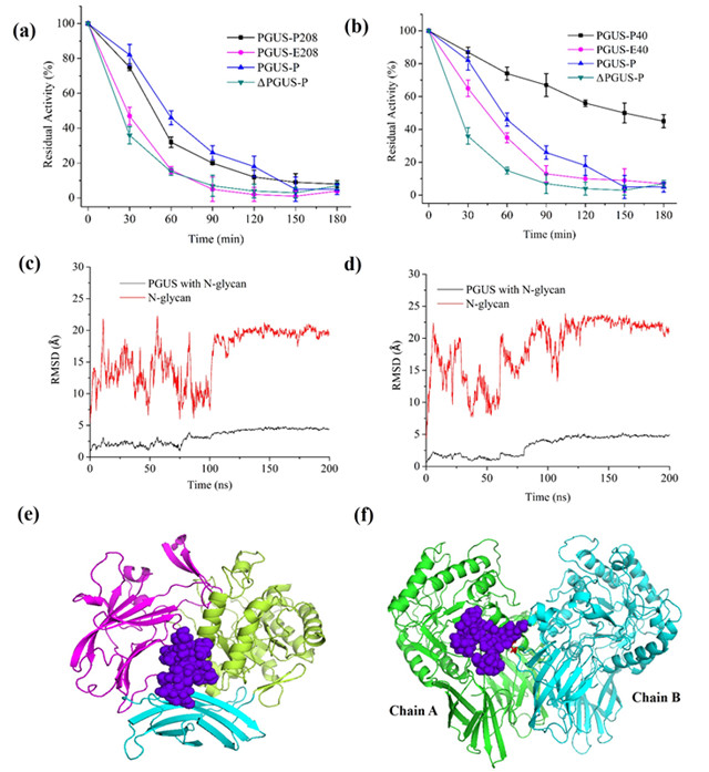 beat365中文官方网站化学与化工学院李春教授课题组在前期完成晶体结构解析的真菌β-葡萄糖醛酸酶(PGUS,同源四聚体结构)为模型蛋白,并将其在毕赤酵母(能够在蛋白质的特定位点引入高甘露糖型糖链)中异源表达(PGUS-P),验证了蛋白质内源的Asn383和Asn594位点的糖基化对PGUS-P的稳定性有显著影响。通过计算机模拟与实验相结合的方法,揭示了PGUS-P的两个內源N-糖基功能类似于“连接臂”,能将空间上距离相近的超二级结构域相连,使得其局部结构更加紧凑,从而提高了蛋白质的整体稳定性(图1)。以此为启发,研究人员通过对PGUS的晶体结构分析,在超二级结构域、结构域、亚基界面间设计了N-糖基化位点,进一步提高了PGUS-P的动力学、热力学稳定性。酶学性质表征并结合全原子分子动力学模拟结果表明,在结构域界面间的Asn208位糖链和周围二个结构域产生的作用力,形成了“糖桥”构型,将蛋白质在70°C下的半衰期提高了2.7倍,去折叠自由能提高了8.4 kJ/mol;而在亚基界面间的Asn40位糖链通过和相邻亚基的作用,形成了“糖卡”构型,将热稳定性提高了7.1倍,去折叠自由能提高了14.6 kJ/mol,同时酶的催化效率也提高了1.7倍(图2)。