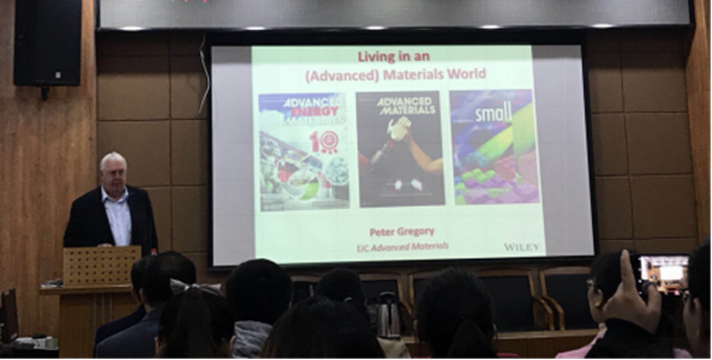 Dr.Peter Gregory简要介绍了《Advanced Materials》及其姊妹刊的发展历程及现状、世界各地在《Advanced Materials》期刊的投稿及稿件录用情况,充分肯定了中国科研工作者在学术界的贡献和地位,还高度赞赏了beat365中文官方网站材料研究及发表Wiley期刊文章。此外,他还推介了Wiley旗下的新期刊《Advanced Healthcare Materials》《 Advanced Energy Materials》和《Advanced Optical Materials》,并从编辑的角度详细介绍了稿件初筛、送审、裁定过程的编辑原则,以及投稿注意事项、如何提高论文投稿的命中率和扩大文章学术界的影响力。