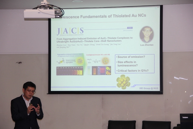 报告详细介绍了高效精准合成高质量的金属纳米团簇的方法学,包括protein-directed法、NaOH-mediated NaBH4还原法 和CO还原法。通过吸收光谱和电喷雾离子化质谱(electrospray ionization mass spectrometry, ESI-MS)等手段追踪了金纳米团簇[Au25(SR)18]-等具有准确组成的团簇的生长机理,在原子层面上揭示了贵金属纳米团簇的生长动力学和方法学。并根据金属纳米团簇的聚集诱导发光(AIE)等荧光性能讨论了其在发光、生物医用等方面的应用。报告深入浅出,精彩纷呈,大家争相提问,在一片热烈的氛围中结束。
