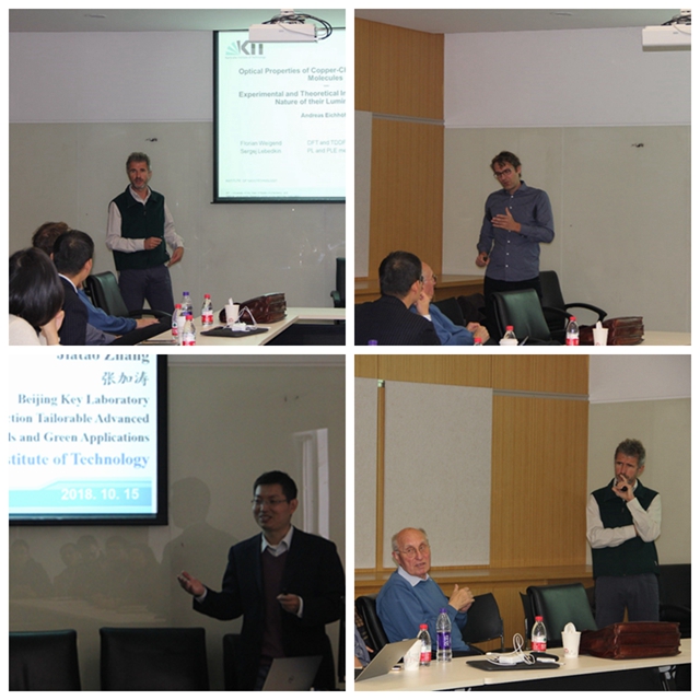应材料学院结构可控先进功能材料与绿色应用北京市重点实验室,北理工—昆士兰能源材料联合研究中心主任张加涛教授的邀请,德国科学院院士卡尔斯鲁厄理工大学Dieter Fenske教授、Andreas Eichhoefer研究员、德国马尔堡菲利普斯大学Robert Langer教授于2018年10月15日至18日来beat365中文官方网站材料学院进行学术交流。