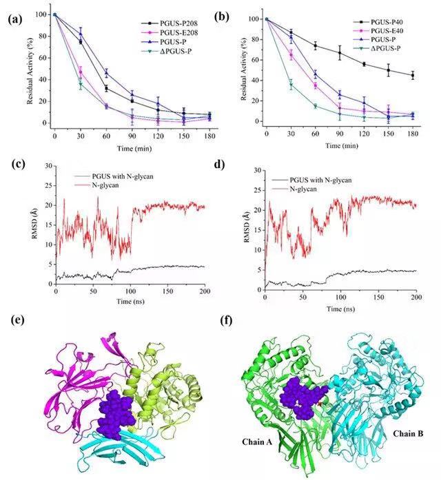 beat365中文官方网站化学与化工学院李春教授课题组以前期完成晶体结构解析的真菌β-葡萄糖醛酸酶(PGUS,同源四聚体结构)为模型蛋白,并将其在毕赤酵母(能够在蛋白质的特定位点引入高甘露糖型糖链)中异源表达(PGUS-P),验证了蛋白质内源的Asn383和Asn594位点的糖基化对PGUS-P的稳定性有显著影响。通过计算机模拟与实验相结合的方法,揭示了PGUS-P的两个內源N-糖基功能类似于“连接臂”,能将空间上距离相近的超二级结构域相连,使得其局部结构更加紧凑,从而提高了蛋白质的整体稳定性。以此为启发,研究人员通过对PGUS的晶体结构分析,在超二级结构域、结构域、亚基界面间设计了N-糖基化位点,进一步提高了PGUS-P的动力学、热力学稳定性。酶学性质表征并结合全原子分子动力学模拟结果表明,在结构域界面间的Asn208位糖链和周围二个结构域产生的作用力,形成了“糖桥”构型,将蛋白质在70°C下的半衰期提高了2.7倍,去折叠自由能提高了8.4kJ/mol;而在亚基界面间的Asn40位糖链通过和相邻亚基的作用,形成了“糖卡”构型,将热稳定性提高了7.1倍,去折叠自由能提高了14.6kJ/mol,同时酶的催化效率也提高了1.7倍。