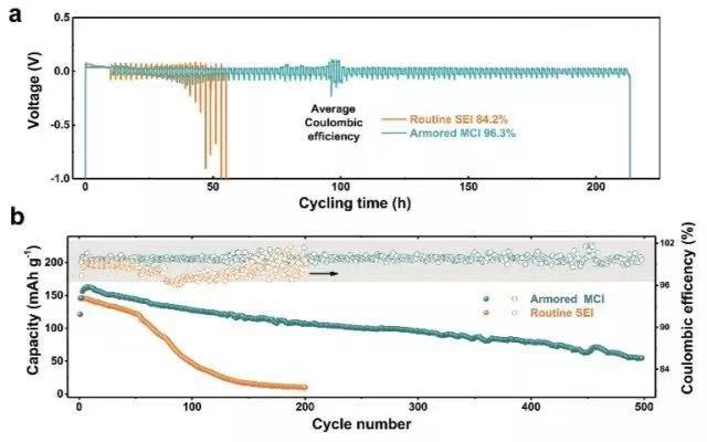 MCI保护界面的金属锂负极用在匹配镍钴锰三元正极(NMC532)的全电池中,电池的平均库伦效率达到了99.8 %;电池的续航能力和稳定性也被显著提升,相比于传统的电极界面中电池经过100次循环后容量降低到50mAh g⁻¹,具有MCI保护层界面的电池在0.5 C(2小时充满额定容量)充放电倍率下,经过500次循环容量依然维持在50mAh g⁻¹,将电池的寿命延长了5倍。
