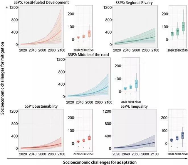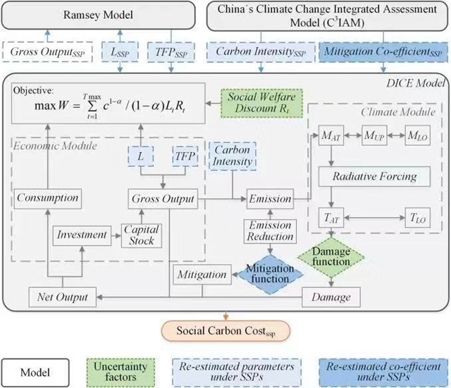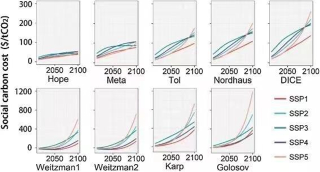 该研究应用魏一鸣教授团队自主开发的“中国气候变化综合评估模型(China’s Climate Change Integrated Assessment Model,以下简称C³IAM)”,与2018年诺贝尔经济学奖得主诺德豪斯教授开发的DICE模型相结合,用C³IAM结果在SSP路径下重新估计了DICE模型中的减排成本函数,在SSP的社会经济假设下对社会碳成本进行估计和不确定性的讨论。结果表明,社会和国家分化和发展中国家快速发展的社会经济特征将会提高排放的社会成本。
