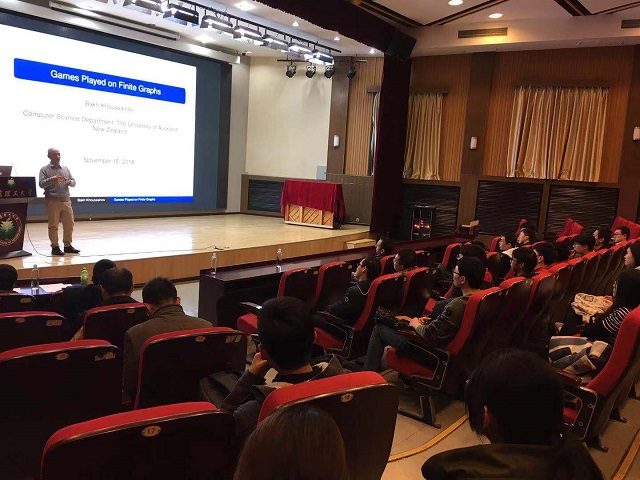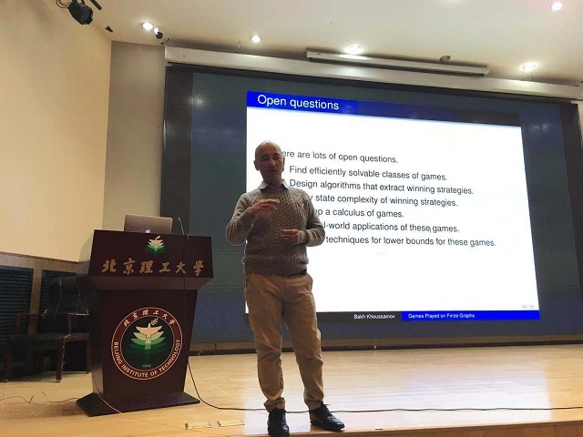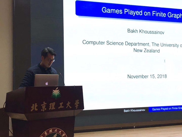 2018年11月16日下午,北理工计算机学院知味讲坛邀请到本次计算机科学与技术学科合格评估国际同行专家评审组组长、新西兰皇家学会成员Bakh Khoussainov教授在七号楼报告厅作主题为《Games played on finite graphs》的学术报告,计算机学院党委副书记、副院长奚英伦,院长助理张子剑出席。报告由奚英伦主持。